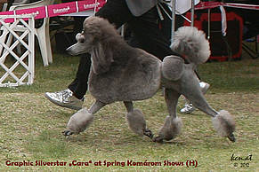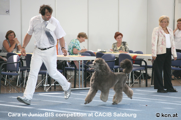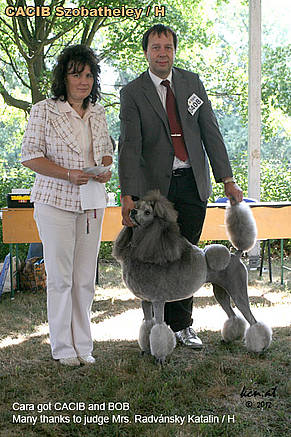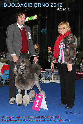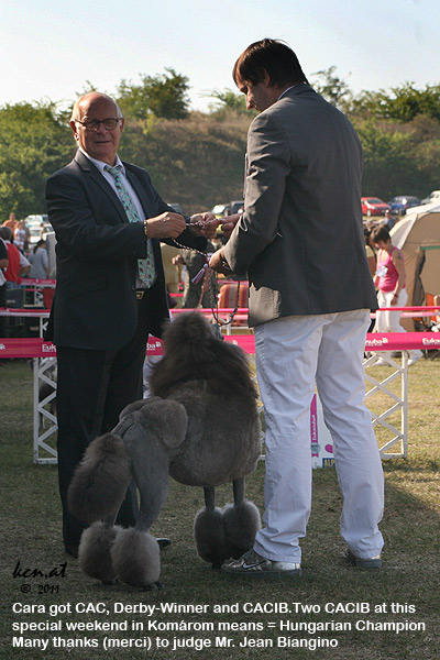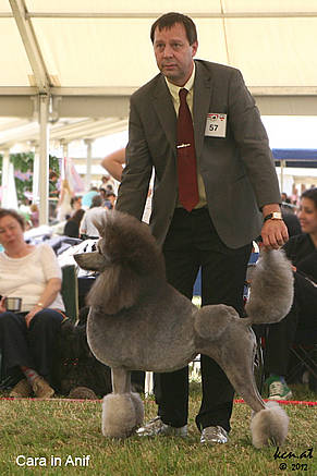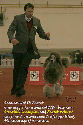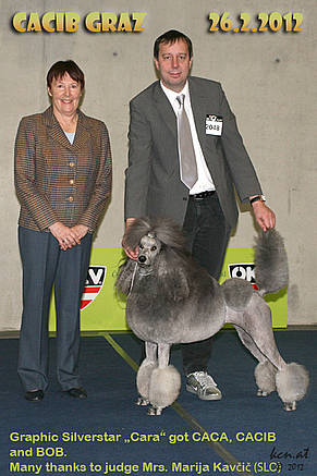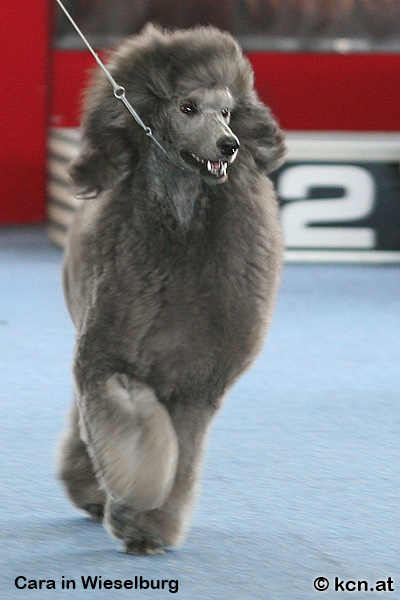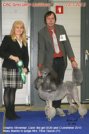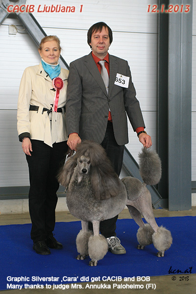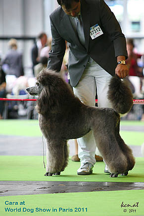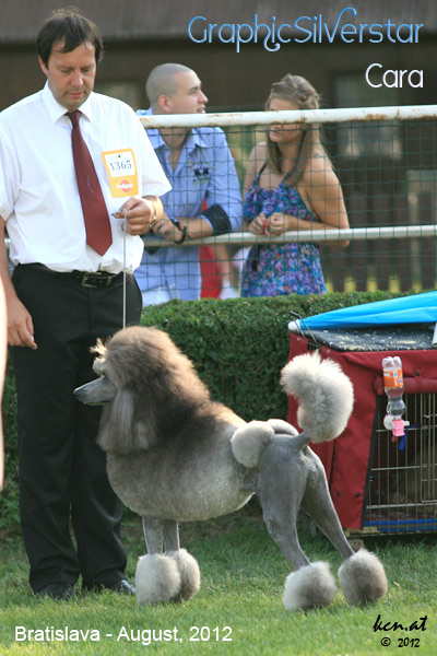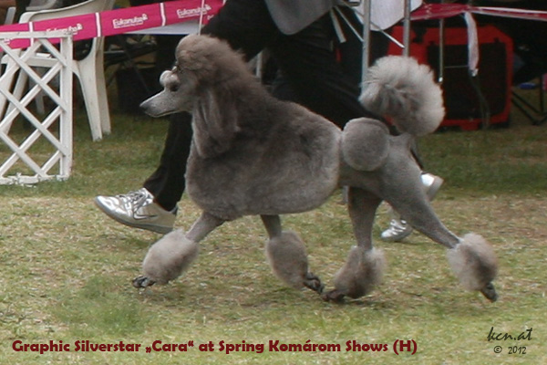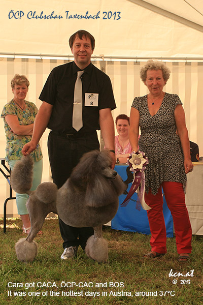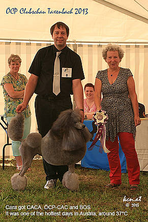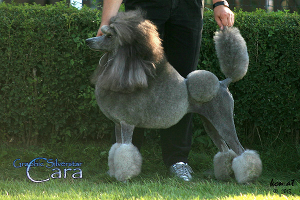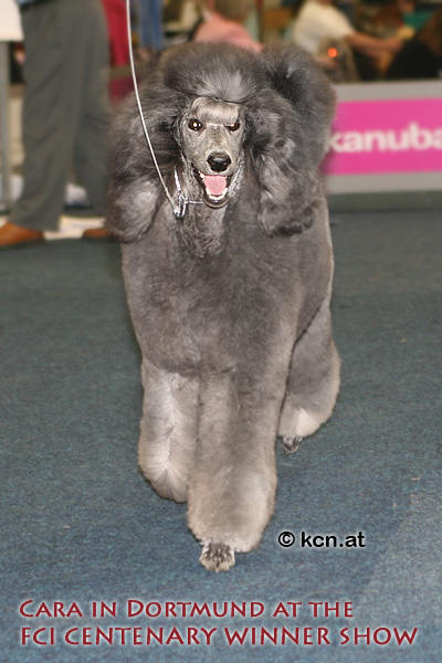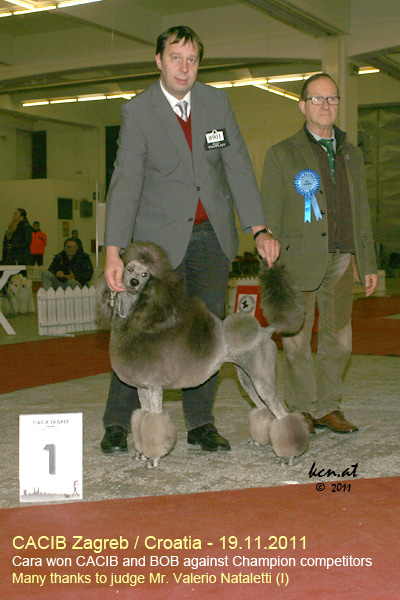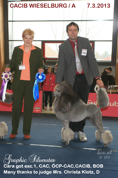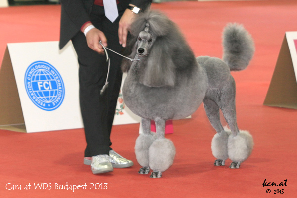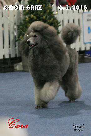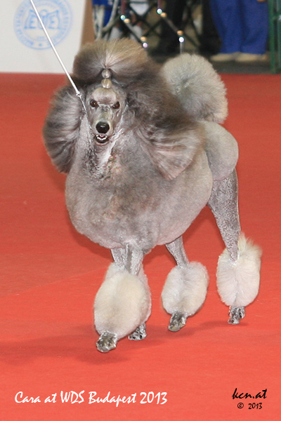 Caras Hauptkarriere lief von 2011 bis 2013. Sie endete wie sie anfing - mit einem BIG BANG! Bei ihrer ersten Ausstellung mit 9 Monaten schlug sie einen Champion und ihre letzte Ausstellung endete mit einem BISS! Was für ein großartiges Ergebnis für einen silbergrauen Großpudel! Sie ist einfach nur toll!