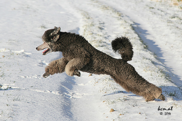 Meaning: "No Angel" is a perfect name for Angie. She is an angel without wings. She still tries to fly ... a true jumping and flying poodle with a heart of gold. It was love from the first moment between Eva and her and at the end the heart succeded over the mind. Dori and her are already big friends.