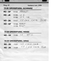 You will get the catalog right after the entrance. If you have paid the registration fee in advance you will get the number from the ring stewards at the desk, else you will get it at the cashier's desk. (in Austrian German: Kassa) Poodles will be judged in order of catalogue numbers. The ring steward will call up the next number(s). Unfortunately it's mostly only in German. Results will be written on the flipchart. Each judged poodle gets a report and a ribbon in different colors depending on the result.