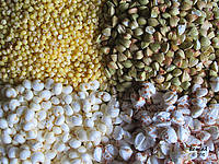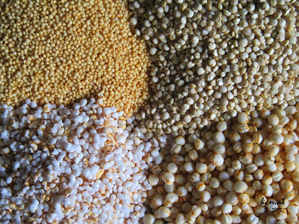 Wir füttern keinen Weizen, Roggen, Gerste oder Mais. An Getreide geben wir Hirse, Dinkelreis, Haferflocken, manchmal Einkornreis, normalen Reis und Kamut. Der Hauptanteil besteht aus den Pseudogetreidesorten Quinoa, Amaranth und Buchweizen. Es gibt alle drei auch in praktisch gepoppter Form. Besonders Buchweizen lieben unsere Pudel sehr.