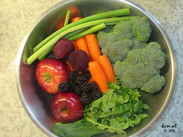 Wir verwenden gerne Salat, Zucchini, Stangensellerie, Karotten, Zucchini, rote Rüben (Beete), Gurke. Wenn möglich sollte das Gemüse kurz schonend gedünstet/dampfgegart werden. Damit erreicht man eine höchstmögliche Aufnahme der Inhaltsstoffe.