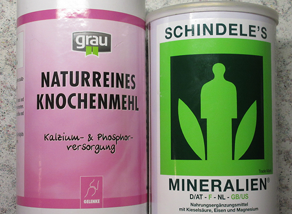 Es gibt, speziell in der "BARF-Abteilung", gute Produkte mit einer ausgewogenen Mischung von Phosphor und Kalzium. Wir geben zur Zeit gerne "Naturreines Knochenmehl" von Grau, "Schindele's Mineralien" und "Barfer's Best". Wir wechseln auch diese Dinge gerne ab und suchen immer wieder nach neuen.